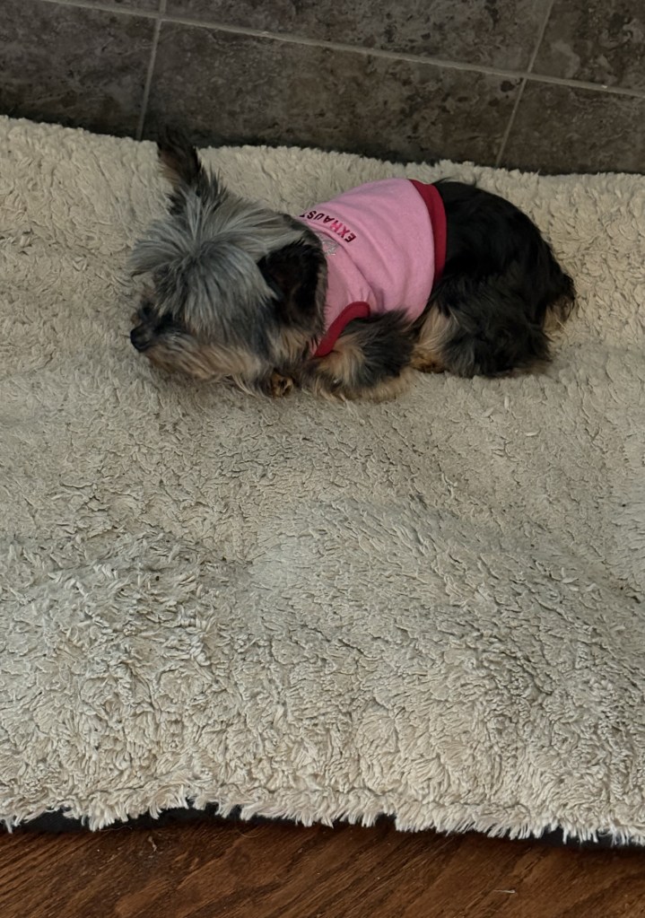 I also realized something funny today when I saw her laying on the giant dog bed in front of the fireplace.
