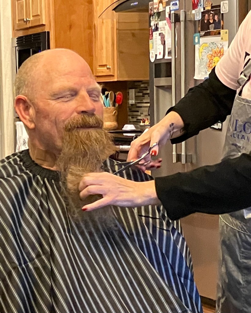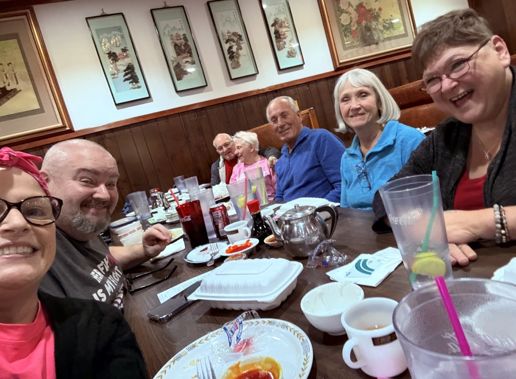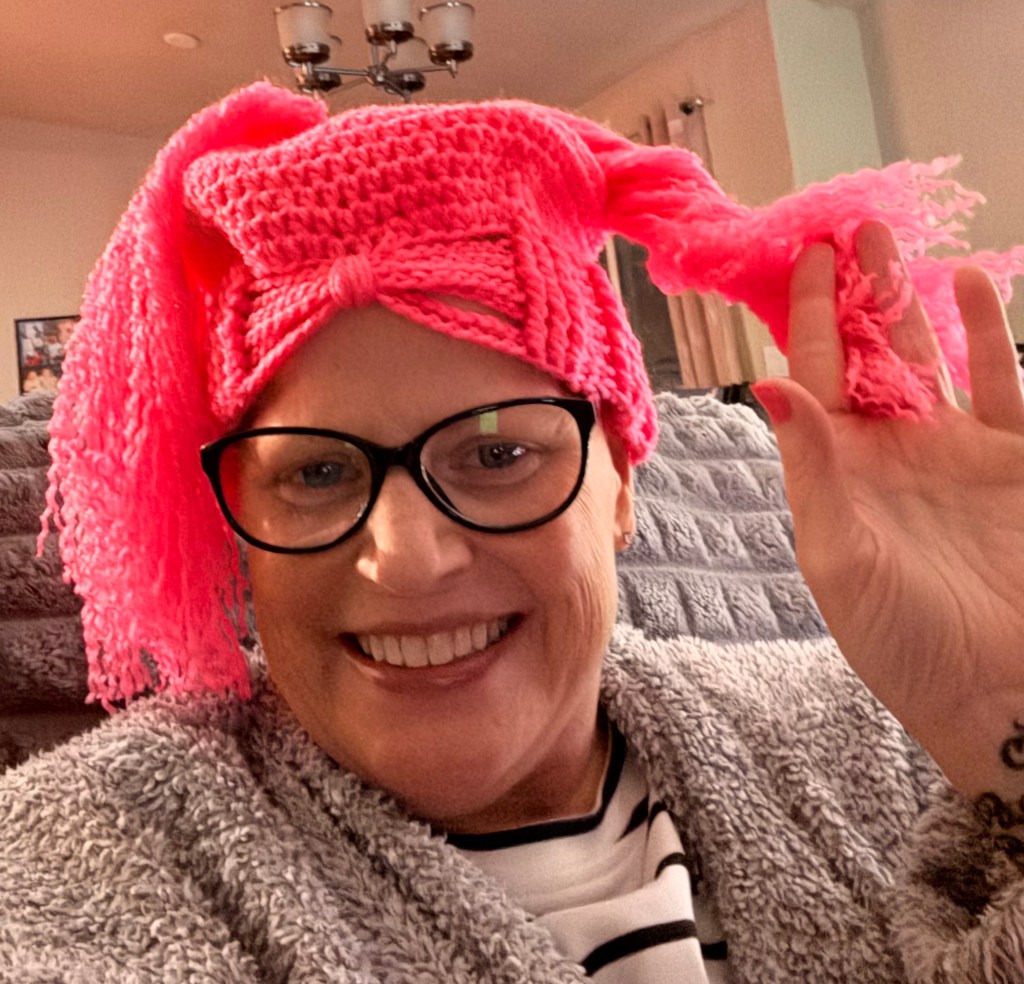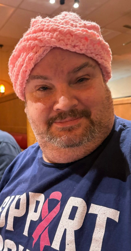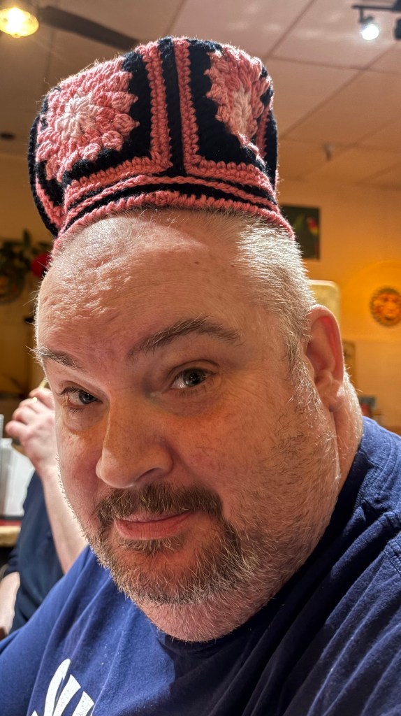I was already wearing my chemo head wrap, so instead of doing a wardrobe change at the table like a lunatic, Casey stepped in and modeled the hats for us. Because of course he did. No hesitation. Full commitment. Taco in one hand, crochet hat on his head.