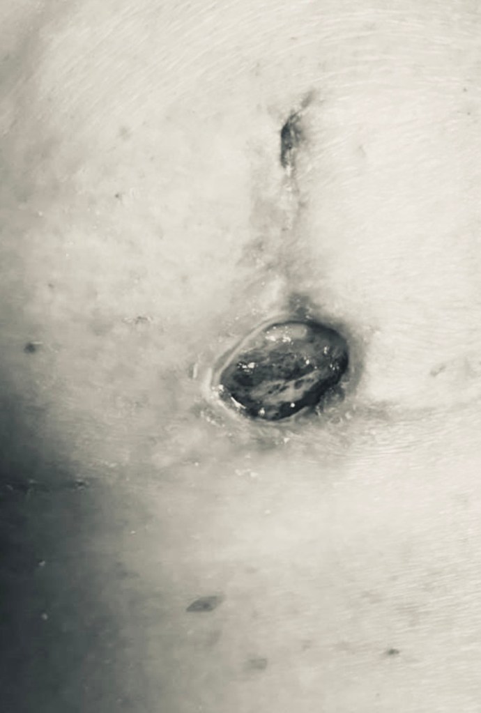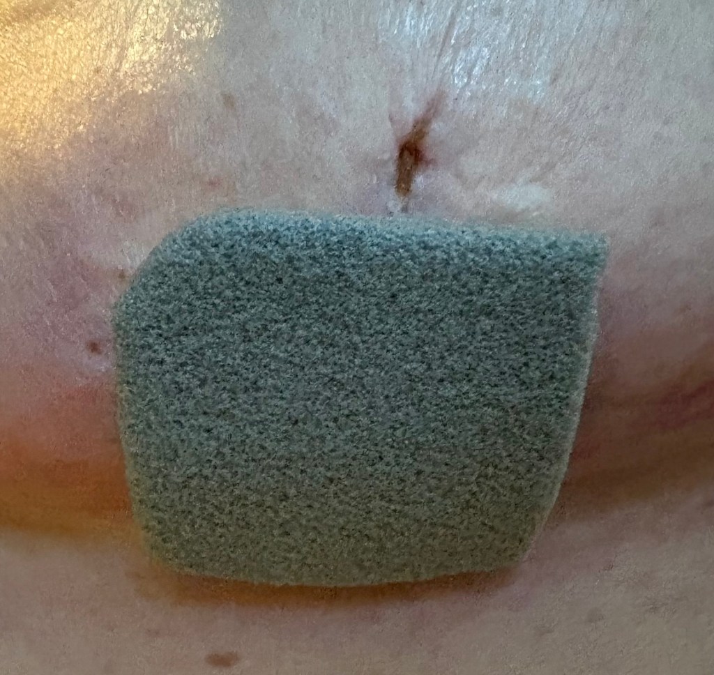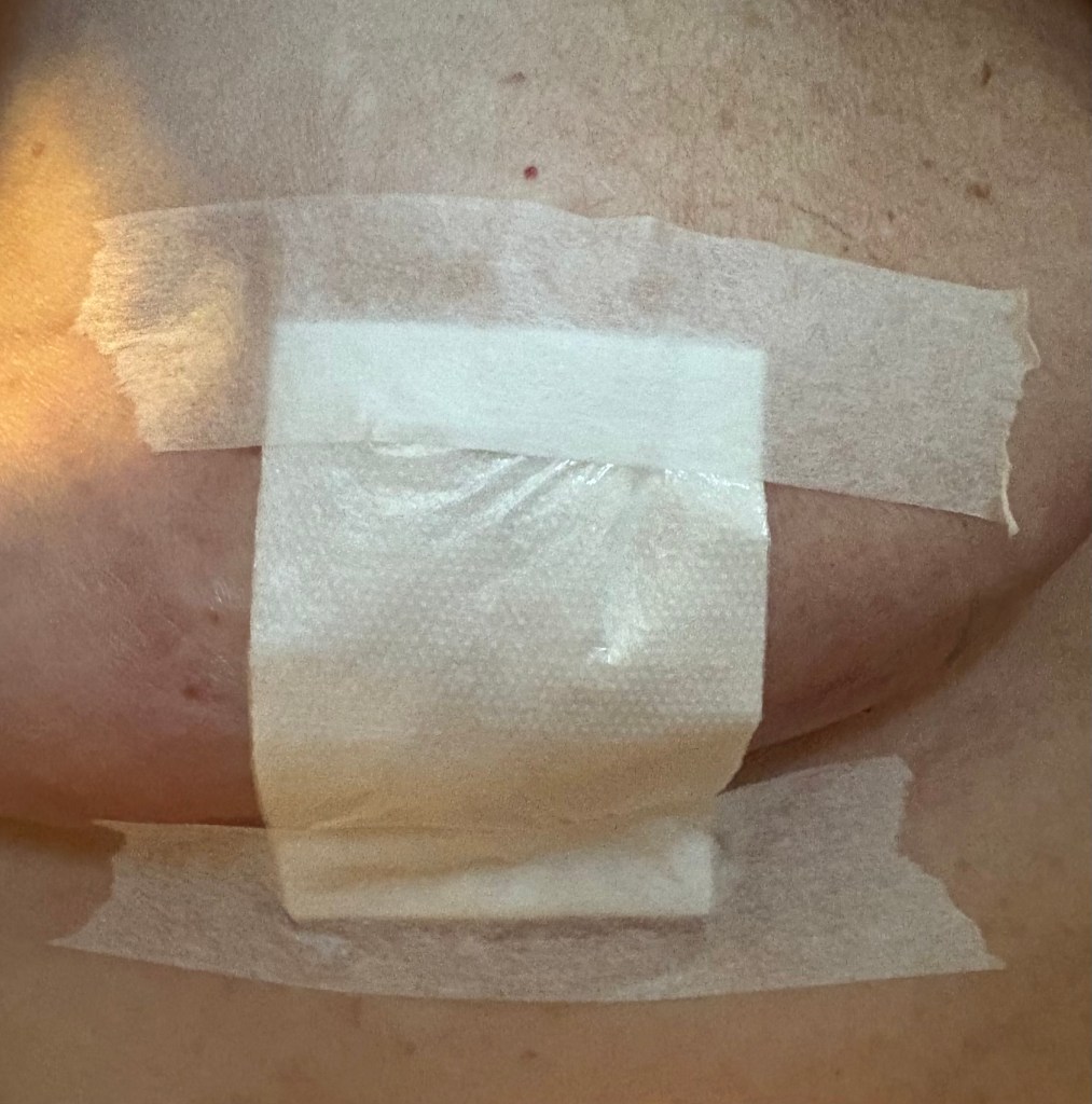This is my right-side T-junction a few weeks ago, back when it was behaving. I’m sparing you the nasty, open wound, gaping hole picture of now because even I can’t really look at it. In this photo, the hole on the bottom was actually a little bigger than the 1 – 1/2 cm that it is now — the one holding up the show right now and keeping my skin from healing the way it should.