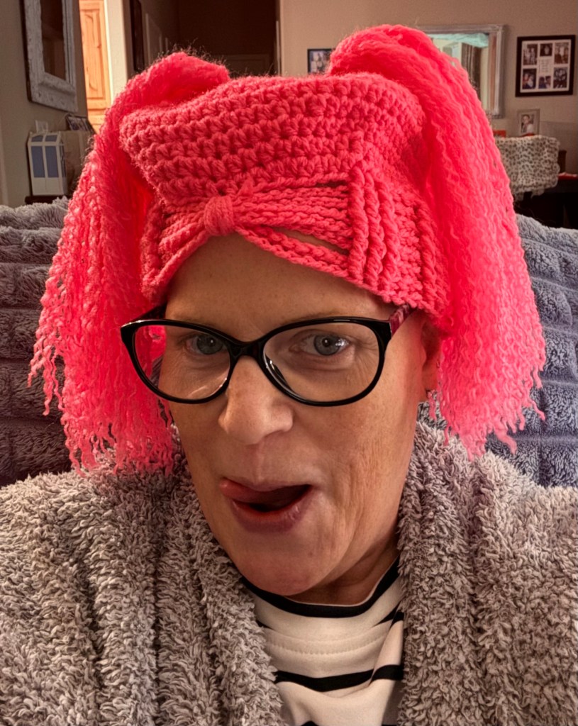 Because it was Taco Tuesday, and we met up with a few friends for dinner. And just when I thought the day couldn’t hold one more thing, Aunt Dee showed up with two new crocheted hats she made for me.